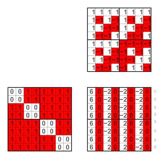 | Keywords: 0011 1111 Walsh spectrum.svg Walsh spectra of 3-ary Boolean functions like 0011 1111 The binary strings are multiplied with a Walsh matrix of order 8 The red squares in the background are additional information and show the product of the binary strings with a binary Walsh matrix own Lipedia Walsh spectrum of 3-ary Boolean functions |