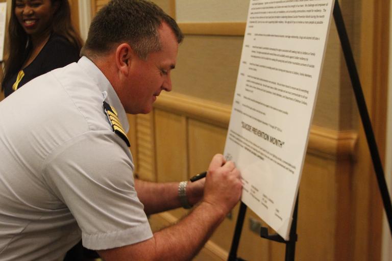 Keywords: pacific hawaii oahu army air force airforce navy marines coast guard coastguard fort shafter fortshafter hale ikeaa haleikeaa suicide prevention month suicidepreventionmonth 8th theater sustainment command 8ththeatersustainmentcommand 8th tsc 8thtsc 9th mission support command 9thmissionsupportcommand 9th msc 9thmsc joint services suicide prevention proclamation military jointservicessuicidepreventionproclamationmilitary u.s. us indoor The first Joint Suicide Prevention Proclamation was signed by representatives from all five branches of the U.S. Military September 7 at the Hale Ikena on Fort Shafter, Hawaii. September is recognized throughout the nation as Suicide Prevention Month and is designed to help raise awareness about suicide and steps to prevent it. The proclamation signing was hosted by the 9th Mission Support Command in Hawaii (Photo by Spc. Jaime Ruiz, 8th TSC Public Affairs/RELEASED) The first Joint Suicide Prevention Proclamation was signed by representatives from all five branches of the U.S. Military September 7 at the Hale Ikena on Fort Shafter, Hawaii. September is recognized throughout the nation as Suicide Prevention Month and is designed to help raise awareness about suicide and steps to prevent it. The proclamation signing was hosted by the 9th Mission Support Command in Hawaii (Photo by Spc. Jaime Ruiz, 8th TSC Public Affairs/RELEASED) |
