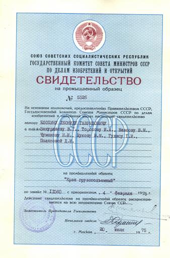 | Keywords: Свидетельство 010002.jpg ru Свидетельство на п омышленный об азец 5526 «К ан г узоподъемный» 1975 год СССР en Industrial Design Certificate No 5526 1975 USSR 2014-09-10 01 51 41 own Dergalev PD-RU-exempt Insignia cc-by-sa-4 0 Industrial design certificates |