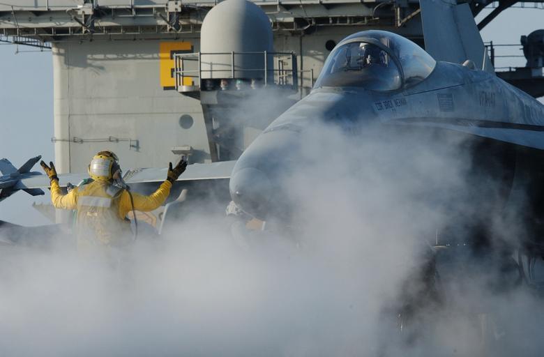Keywords: 011219-N-9769P-091 CVN 74 - Flight Deck Ops.jpg en 011219-N-9769P-091 At sea aboard USS John C Stennis CVN 74 Dec 19 2001- An Aviation Boatswain's Mate directs an F/A-18 Hornet from the Argonauts of Strike Fighter Squadron One Four Seven VFA-147 onto the catapult Stennis and her embarked Carrier Air Wing CVW 9 are deployed in support of Operation Enduring Freedom U S Navy photo by Photographer's Mate 3rd Class Jayme Pastoric RELEASED 011219-N-9769P-091 Navy http //www navy mil/view_image asp id 259 U S Navy photo by Photographer's Mate 3rd Class Jayme Pastoric PD-USGov-Military-Navy Aviation Boatswain's Mates Handlers Aboard USS John C Stennis CVN-74 F/A-18 Hornet on flight decks Strike Fighter Squadron 147 United States Navy |