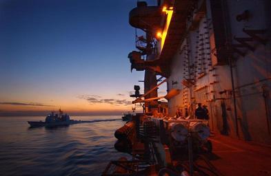 Keywords: 011222-N-2722F-131 USS Port Royal Underway.jpg en 011222-N-2722F-131 At sea aboard USS John C Stennis CVN 74 Dec 22 2001 - As the sun sets the guided-missile cruiser USS Port Royal CG 73 left pulls away from replenishment ship USNS Concord T-AFS 5 center John C Stennis and its carrier battle group are conducting missions in support of Operation Enduring Freedom U S Navy photo by Photographer's Mate Second Class James A Farrally II Released 011222-N-2722F-131 Navy http //www navy mil/view_image asp id 293 U S Navy photo PD-USGov-Military-Navy Breakaway maneuver underway replenishment Aboard USS John C Stennis CVN-74 USNS Concord T-AFS-5 |
