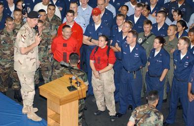 Keywords: 011225-N-2722F-020 Gen. Franks Addresses Crew.jpg en 011225-N-2722F-020 At sea aboard USS John C Stennis CVN 74 Dec 25 2001- Christmas Day General Tommy R Franks Commander in Chief United States Central Command addresses Sailors and Marines to the ship and her embarked Carrier Air Wing Nine CVW-9 General Franks made the Christmas day visit to Stennis to personally deliver his appreciation to the ship's officers and crew for their part in supporting Operation Enduring Freedom U S Navy photo by Photographer's Mate Second Class James A Farrally II Released 2001-12-25 011225-N-2722F-020 Navy http //www navy mil/view_image asp id 298 U S Navy photo by Photographer's Mate Second Class James A Farrally II PD-USGov-Military-Navy Tommy Franks Guests aboard USS John C Stennis CVN-74 Public speaking Christmas 2001 in the United States War in Afghanistan in 2001 25 December 2001 in water transport December 2001 photographs Military people in 2001 People of the United States in 2001 Desert Camouflage Uniform in 2001 |
