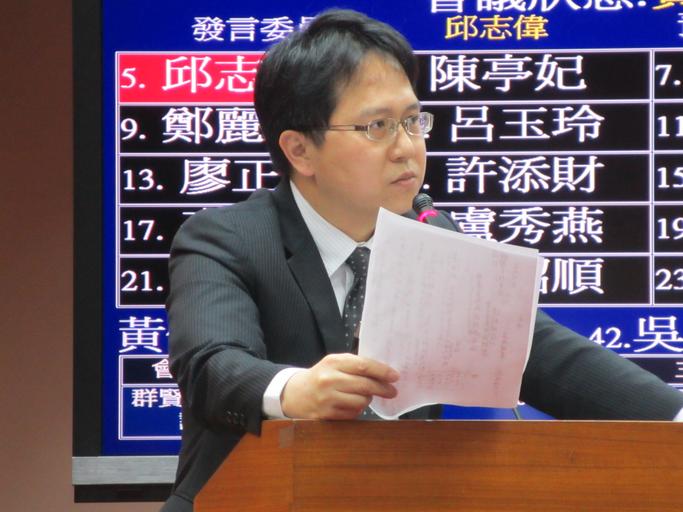 | Keywords: 文化部長龍應台和陸委會主委王郁琦接受質詢 02.jpg zh-tw 台灣 野黨民 黨立委邱志偉(美 之音張永泰拍 ) 2014-01-08 10 21 01 http //www voachinese com/a/reactions-on-cross-strait-media-meetingcontroversy-20140109/1826378 html 張永泰 other versions Custom license marker 2016 08 06 PD-USGov-VOA 8th Legislative Yuan January 2014 Chiu Chih-wei |