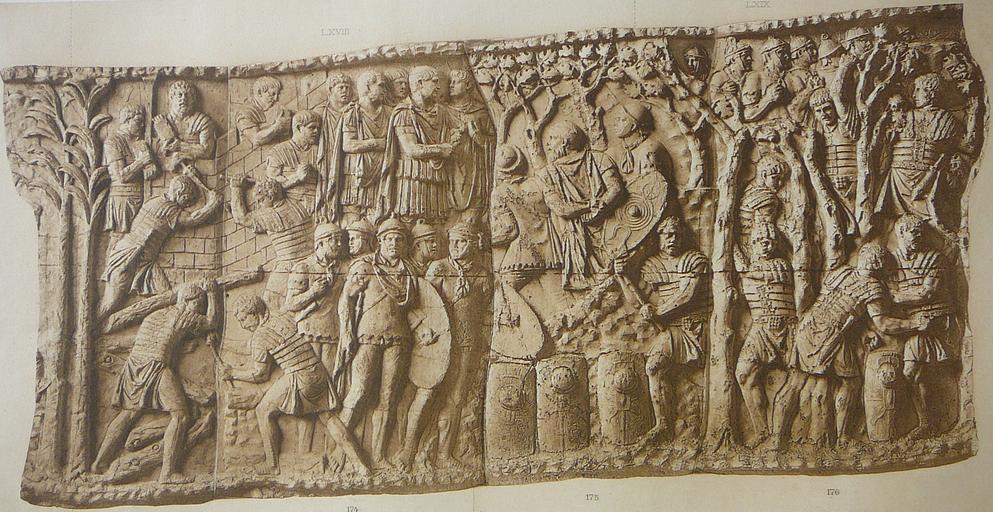 Keywords: 049 Conrad Cichorius, Die Reliefs der Traianssäule, Tafel XLIX.jpg attributed to Graphics Die Reliefs der Traianssäule nach Conrad Cichorius Tafel XLIX Einbringung eines Gefangenen Szene LXVIII ; Arbeitende Legionäre im Wald Szene LXIX The Reliefs of Trajan's Column by Conrad Cichorius Plate number XLIX A prisoner is brought in Scene LXVIII ; Legionaries wood-clearing Scene LXIX Sculpture AD 113 ; Graphics 1896 Sculpture bas-relief; Graphics monochrome graphics based on photographs Sculpture Institution Trajan's Column object history credit line accession number Conrad Cichorius Die Reliefs der Traianssäule Erster Tafelband Die Reliefs des Ersten Dakischen Krieges Tafeln 1-57 Verlag von Georg Reimer Berlin 1896 other versions 1932 Trajan's Column - Cichorius Plates |