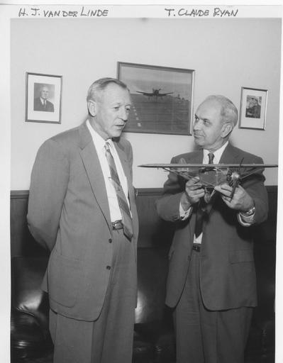 | Keywords: sdasm aviation aeronautics san diego air and space museum sandiegoairandspacemuseum ryan lindbergh tc ryan tcryan aviator tubal claude ryan tubalclauderyan t. claude ryan tclauderyan claude ryan clauderyan john van der linde johnvanderlinde johnny van der linde johnnyvanderlinde van der linde vanderlinde monochrome blackandwhite indoor black and white T. Claude Ryan Ryan and long-term employee H.J. van der Linde. With model Spirit marking the 25th anniversary of the Lindbergh flight. Repository: San Diego Air and Space Museum Archive T. Claude Ryan Ryan and long-term employee H.J. van der Linde. With model Spirit marking the 25th anniversary of the Lindbergh flight. Repository: San Diego Air and Space Museum Archive |