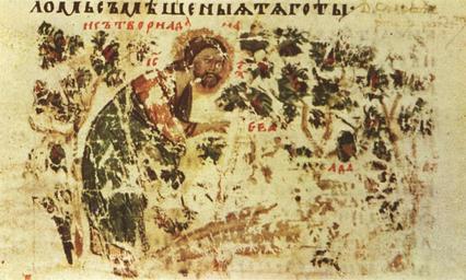 Keywords: 04-manasses-chronicle.jpg иниатю а 4 от анасиевата летопис 14 век Създаването на Ева от еб ото Адамово Miniature 4 from the Constantine Manasses Chronicle 14 century Creation of Eve from the Adam's rib Скани ана от книгата иниатю и на анасиевата летопис Иван Дуйчев Издателство Бълга ски художник София 1962 Scanned from book Miniatures from the Manasses Chronicle Ivan Duichev Bulgarski hudojnik Publishing house Sofia 1962 Original 14 century Original Constantine Manasses PD-old-100 Constantine Manasses Chronicle Creation of Eve Miniatures Creation in miniatures Miniatures