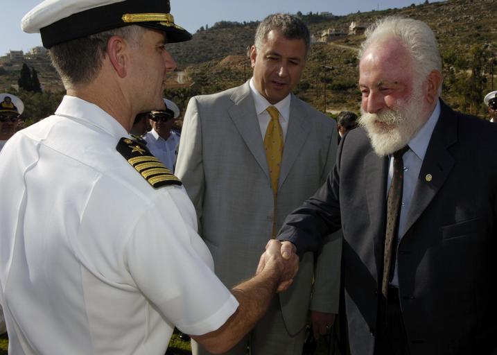 Keywords: 060523-N-9742R-160.jpg en 060523-N-9742R-160 Souda Bay Crete May 23 2006 - Nuclear-powered aircraft carrier USS Enterprise CVN 65 Commanding Officer Capt Larry Rice meets Mr Georgious Kopasis the most highly decorated World War II veteran of the Battle of Crete at an official wreath-laying ceremony at the Souda Bay WWII Veterans Cemetery to commemorate the anniversary of the Battle of Crete during a port call to Souda Bay The Enterprise Carrier Strike Group is on a scheduled six-month deployment in support of the global war on terrorism While in the Naval Forces Europe Area of Responsibility the Strike Group will conduct training and theater security cooperation engagements with several countries including Bulgaria Germany Croatia and Greece U S Navy photo by Photographer's Mate 2nd Class Milosz Reterski RELEASED http //www navy mil/view_image asp id 34852 U S Navy photo by Photographer's Mate 2nd Class Milosz Reterski RELEASED 2006-05-23 PD-USGov-Military-Navy Images by Alaniaris/PD uploads People of Crete |