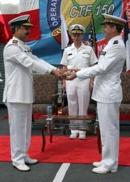 | Keywords: 080225-N-9167V-007.jpg en Pakistani navy Commodore Khan Hasham Bin Saddique left hands a spyglass to French navy Rear Adm Jean L Kerignard during a change of command ceremony aboard PNS Tippu Sultan D 186 while in port at Mina Salman Pier Bahrain Feb 25 2008 The transfer of authority concluded the Pakistani navy's second successful command of Combined Task Force 150 which conducts maritime security operations in the Gulf of Aden Gulf of Oman Arabian Sea Red Sea and the Indian Ocean The task force established toward the beginning of Operation Enduring Freedom is comprised of warships from numerous coalition nations including France Germany Pakistan United Kingdom and the United States http //dams defenseimagery mil/defenselink/assetcolcreate action name previewcol id 6ab970ebe5550d8a6895f235b33c72f86d0383ac scope request nextpage /vims_dlink_preview jsp Mass Communication Specialist 2nd Class Edward Vasquez 2008-02-25 PD-USGov-Military-Navy Admirals of France Change of command Monoculars n |