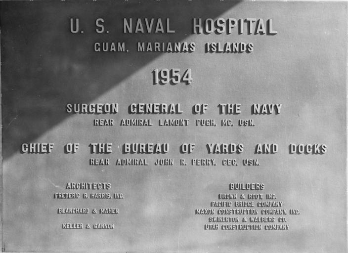 | Keywords: blackandwhite text monochrome writing black and white 09-5030-60  U.S. Naval Hospital. Dedication plaque. "1954 Surgeon General of the Navy Rear Admiral Lamont Pugh, Medical Corps, U.S. Navy; Chief of the Bureau of Yards and Docks Rear Admiral John R. Perry, CEC [Civil Engineer Corps?], U.S. Navy; Architects Frederic R. Harris, Inc., Blanchard and Maher, Keller and Gannon; Builders Brown and Root, Inc., Pacific Bridge Company, Maxon Construction Company, Inc., Swinerton and Walberg Co., Utah Construction Company." [Scene.] Guam, Marianas Islands, 11/29/1954; VU-5-7794-11-54. 09-5030-60  U.S. Naval Hospital. Dedication plaque. "1954 Surgeon General of the Navy Rear Admiral Lamont Pugh, Medical Corps, U.S. Navy; Chief of the Bureau of Yards and Docks Rear Admiral John R. Perry, CEC [Civil Engineer Corps?], U.S. Navy; Architects Frederic R. Harris, Inc., Blanchard and Maher, Keller and Gannon; Builders Brown and Root, Inc., Pacific Bridge Company, Maxon Construction Company, Inc., Swinerton and Walberg Co., Utah Construction Company." [Scene.] Guam, Marianas Islands, 11/29/1954; VU-5-7794-11-54. |
