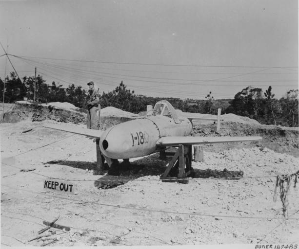 | Keywords: history blackandwhite monochrome outdoor black and white 09-7921-35 Flying Coffin - One of the Japanese 'suicide planes', abandoned by the enemy at Yontan airfield, Okinawa, is guarded by Marine Private First Class Clyde Carr, of Salem, Missouri. They are similar to the first German V-Bombs except that they carried a pilot to his death. Only a few of these "Baka Bombs" as they have been dubbed, were used at Okinawa and these had little success. [Airplanes.] [World War 2.] [Scene.] WWII -Air and Sea Battle Photos. MHQ 117,649. 09-7921-35 Flying Coffin - One of the Japanese 'suicide planes', abandoned by the enemy at Yontan airfield, Okinawa, is guarded by Marine Private First Class Clyde Carr, of Salem, Missouri. They are similar to the first German V-Bombs except that they carried a pilot to his death. Only a few of these "Baka Bombs" as they have been dubbed, were used at Okinawa and these had little success. [Airplanes.] [World War 2.] [Scene.] WWII -Air and Sea Battle Photos. MHQ 117,649. |