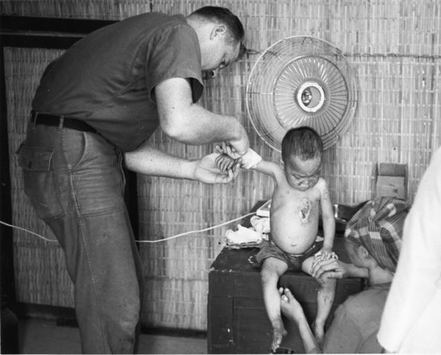 | Keywords: blackandwhite monochrome black and white 09-7971-65 Hospital Corpsman Bill Wilson treats Vietnamese baby for burns suffered from gasoline lamp. Wilson has treated 22 such cases and not one has been left with permanent scars. [Children.] [Vietnam War.] [Scene.] Vietnam - Treating Civilians. 05/29/1969; U.S.N. Photo by PH2 Kauls; U.S. Navy 09-7971-65 Hospital Corpsman Bill Wilson treats Vietnamese baby for burns suffered from gasoline lamp. Wilson has treated 22 such cases and not one has been left with permanent scars. [Children.] [Vietnam War.] [Scene.] Vietnam - Treating Civilians. 05/29/1969; U.S.N. Photo by PH2 Kauls; U.S. Navy |