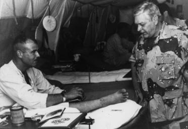 Keywords: blackandwhite monochrome black and white Navy Surgeon General Vice Admiral James A. Zimble, Medical Corps, U.S. Navy, right, chats with a patient during a visit to Fleet Hospital 5. Zimble commended Navy medical personnel at the Navy's first activated fleet hospital for providing the best medical care possible. [Persian Gulf War.] Desert Storm Photos. 12/1990; U.S. Navy Photo by HM2 Jim Moyer. 09-7988-101 Navy Surgeon General Vice Admiral James A. Zimble, Medical Corps, U.S. Navy, right, chats with a patient during a visit to Fleet Hospital 5. Zimble commended Navy medical personnel at the Navy's first activated fleet hospital for providing the best medical care possible. [Persian Gulf War.] Desert Storm Photos. 12/1990; U.S. Navy Photo by HM2 Jim Moyer. 09-7988-101 |