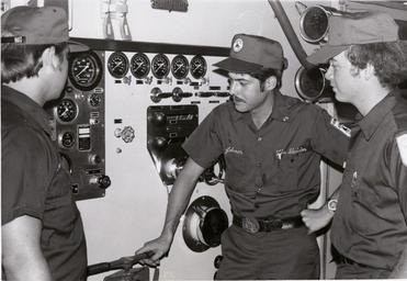 | Keywords: blackandwhite black and white 09-8048-105  HM2 [Hospital Corpsman 2nd Class] Robert W. Johnson, leading petty officer of the medical department, USS Kalamazoo, is a volunteer firefighter with the Jacksonville, Florida fire department in his off duty hours. Here Johnson (center) is shown with fellow firemen. [Portraits.] [Scene.] Hospital Corpsmen - in action. 12/1976 09-8048-105  HM2 [Hospital Corpsman 2nd Class] Robert W. Johnson, leading petty officer of the medical department, USS Kalamazoo, is a volunteer firefighter with the Jacksonville, Florida fire department in his off duty hours. Here Johnson (center) is shown with fellow firemen. [Portraits.] [Scene.] Hospital Corpsmen - in action. 12/1976  |
