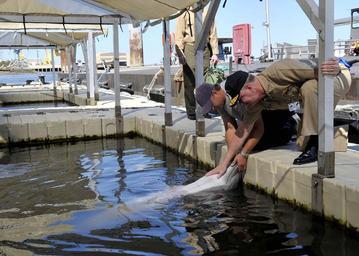 | Keywords: 1000th Trident Patrol Commemoration Ceremony DVIDS152477.jpg en Chief of Naval Operations Adm Gary Roughead pets Winache a dolphin at the marine mammals facility at port operations at Naval Submarine Base Kings Bay Roughead is in Naval Region Southeast to attend the commemoration ceremony for the 1000th Trident patrol and to visit various naval facilities to get a first-hand look at the work being done by Sailors and Navy civilians in the region 2009-02-19 https //www dvidshub net/image/152477 090219-N-+++++-157 2009-02-21 05 32 KINGS BAY GA US PD-USGov-Military-Navy Gary Roughead Images from DoD uploaded by Fæ |
