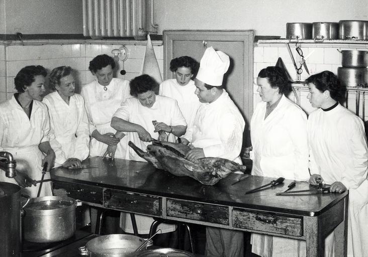 | Keywords: restaurant kitchen oppdal turisthotell oppdalturisthotell norsk spisevognselskap norskspisevognselskap kjøkken blackandwhite indoor black and white Gris til jul! Opplæring på kjøkkenet, Oppdal Turisthotell. Hotellet åpnet i 1924, og ble drevet av Norsk Spisevognselskap fram til 1973, da det ble solgt til andre eiere.  I arkivet etter Norsk Spisevognselskap er det ca. 150 fotografier fra perioden 1919 - 1974. De fleste bildene som finnes er fra turisthotellene som selskapet drev, men det finnes også bilder fra togsett og restaurantvogner. Fotografiene viser ofte ansatte i arbeid og gir et godt bilde av hvordan det var å arbeide i flere av yrkene i A/S Norsk Spisevognselskap.  Fotograf: Cornelius Jacobsen  Arkivreferanse: Pa1528_ua2_012  Pork for Christmas! Training in the kitchen, Oppdal Tourist Hotel. The hotel opened in 1924, and was run by Norsk Spisevognselskap until 1973, when it was sold to other owners.  In the archive of Norsk Spisevognselskap there are approx. 150 photographs covering the period 1919-1974. Most of them are from the tourist hotels that the company ran, but there are also photos of train sets and restaurant coaches. The photos often show employees at work and give a good impression of what it was like to work for A/S Norsk Spisevognselskap.  Gris til jul! Opplæring på kjøkkenet, Oppdal Turisthotell. Hotellet åpnet i 1924, og ble drevet av Norsk Spisevognselskap fram til 1973, da det ble solgt til andre eiere.  I arkivet etter Norsk Spisevognselskap er det ca. 150 fotografier fra perioden 1919 - 1974. De fleste bildene som finnes er fra turisthotellene som selskapet drev, men det finnes også bilder fra togsett og restaurantvogner. Fotografiene viser ofte ansatte i arbeid og gir et godt bilde av hvordan det var å arbeide i flere av yrkene i A/S Norsk Spisevognselskap.  Fotograf: Cornelius Jacobsen  Arkivreferanse: Pa1528_ua2_012  Pork for Christmas! Training in the kitchen, Oppdal Tourist Hotel. The hotel opened in 1924, and was run by Norsk Spisevognselskap until 1973, when it was sold to other owners.  In the archive of Norsk Spisevognselskap there are approx. 150 photographs covering the period 1919-1974. Most of them are from the tourist hotels that the company ran, but there are also photos of train sets and restaurant coaches. The photos often show employees at work and give a good impression of what it was like to work for A/S Norsk Spisevognselskap. |
