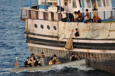 Keywords: 110813-N-XQ375-361.jpg en 110813-N-XQ375-361 GULF OF ADEN Aug 13 2011 Crew members aboard the Sri Lankan-flagged cargo vessel Al Habib raise a bag of supplies from a visit board search and seizure team from the guided-missile destroyer USS Mitscher DDG 57 and a Coast Guard advanced interdiction team in a rigid hull inflatable boat Mitscher responded to Al Habib's distress call and provided two three-gallon containers of water four cases of bottled water and 20 loaves of bread to the 17 crew members Mitscher is deployed to the U S 5th Fleet area of responsibility conducting maritime security operations and support missions as part of Operations Enduring Freedom and New Dawn U S Navy photo by Mass Communication Specialist 3rd Class Deven B King/Released 2011-08-13 http //www navy mil/list_single asp id 106067 U S Navy photo by Mass Communication Specialist 3rd Class Deven B King/Released PD-USGov Uploaded with UploadWizard Aboard USS Mitscher DDG-57 Combined Task Force 150 Rigid-hulled inflatable boats Photographs by Deven King |