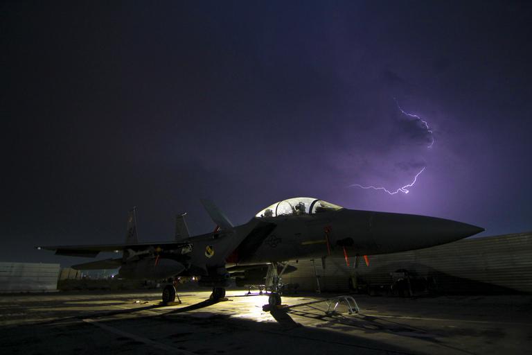 MAKE A MEME View Large Image Air Force F-15E Strike Eagle is illuminated by a lightning storm near Bagram Air Field, Afghanistan, on Oct. 6, 2011. U.S. Air Force Photo/Tech. Sgt. Matt Hecht A U.S. Air Force F-15E Strike Eagle is illuminated by a lightning storm near ...