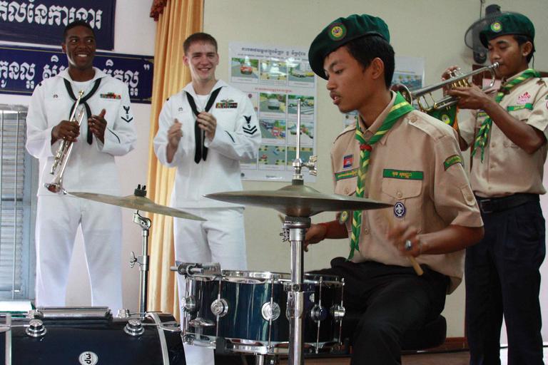 | Keywords: 111025-N-VC635-866 (6283701860).jpg  From left U S Navy Musician 3rd Class Anthony Chiles and Musician 2nd Class James Caliva both with the U S 7th Fleet Band ensemble Orient Express watch students from Wat Koh High School perform during a master class at the school in Phnom Penh Cambodia Oct 25 2011 The band visited Cambodia part of Cooperation Afloat Readiness and Training 2011 part of a series of bilateral exercises held annually in Southeast Asia to strengthen relationships and enhance force readiness U S Navy photo by Musician 3rd Class Joshua Haney/Released https //www flickr com/photos/39955793 N07/6283701860/ 111025-N-VC635-866 2011-10-25 12 14 https //www flickr com/people/39955793 N07 U S Department of Defense Current Photos PD-USGov U S Department of Defense Current Photos https //flickr com/photos/39955793 N07/6283701860 2016-09-03 13 11 51 United States Government Work Phnom Penh United States Department of Defense |
