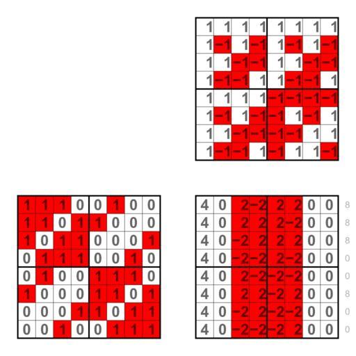 | Keywords: 1110 0100 Walsh spectrum.svg Walsh spectra of 3-ary Boolean functions like 1110 0100 The binary strings are multiplied with a Walsh matrix of order 8 The red squares in the background are additional information and show the product of the binary strings with a binary Walsh matrix own Lipedia Walsh spectrum of 3-ary Boolean functions |