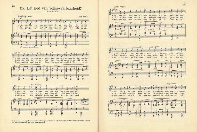 Keywords: 117 Het lied van Volksweerbaarheid, pagina 166 & 167.jpg Kun je nog zingen zing dan mee Muziek en teksten origineel gepubliceerd voor 1900 own 1915 author PD-old Kun je nog zingen zing dan mee