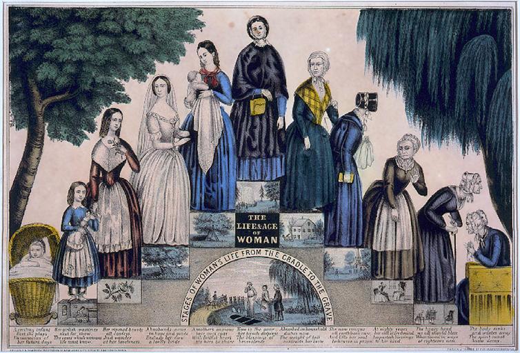 | Keywords: 11-stages-womanhood-1840s.jpg The Life Age of Woman - Stages of Woman's Life from the Cradle to the Grave a ca 1849 U S print illustrating 11 chronological stages of virtuous womanhood with the 30's evidently considered to be the peak years each accompanied by a descriptive verse couplet At left is a flourishing green tree at right a symbolic weeping willow For another version of this print see File Life and age of woman jpg For a similar German-language graphic see File Waldenbuch-Stufenalter der Frau52657a jpg An approximate transcription of the verse couplets in the image some of the words are quite hard to read 1 Infant in cradle A wailing infant first she plays Unconscious of her future days 2 Young girl with doll Her girlish pastimes reveal for show The cares which woman's life must know 3 Late teen girl in grownup clothes Her ripened beauty all confess And wonder at her loveliness 4 Bride in white dress and veil A husband's arms in hope and pride Enclasp her now a lovely bride 5 Young mother holding baby A mother's anxious love and care With toilful heart is hers to share 6 Dressed to go outdoors i e now that she no longer has babies or toddlers in the house she can now take an interest in matters outside the home ” though in a strictly private and individual charitable capacity of course Now to the poor her hands dispense the blessings of benevolence 7 Middle-aged woman first declining step Absorbed in household duties now The weight of toil contracts her brow 8 In black bonnet and holding handkerchief suggesting the latter stages of mourning perhaps her husband has died She now resigns all earthbound care And lifts her soul to heaven in prayer 9 Old wearing spectacles At eighty years her well-stored mind Imparts its blessings to her kind 10 Bent over using cane The hoary head us all should bless Who abound in ways of righteousness 11 Sitting in chair knitting The body sinks and wastes away The spirit cannot know dismay Vignette under arch Funeral scene There are smaller vignettes under each of the nine steps of the arch Edited from image http //memory loc gov/master/pnp/cph/3g00000/3g03000/3g03600/3g03651u tif at the Library of Congress website ---- Bibliographic information found on the LoC site TITLE The life age of woman Stages of woman's life from the cradle to the grave / Kelloggs Comstock N Y Hartford Conn CALL NUMBER PGA - Kelloggs Comstock--The life age of woman A size P P REPRODUCTION NUMBER LC-USZC4-3651 color film copy transparency LC-USZ62-83539 b w film copy neg MEDIUM 1 print lithograph hand-colored CREATED/PUBLISHED Buffalo Ensign Thayer between 1848 and 1850 CREATOR Kelloggs Comstock SUBJECTS Women--1840-1850 Human life cycle--1840-1850 FORMAT Lithographs Hand-colored 1840-1850 REPOSITORY Library of Congress Prints and Photographs Division Washington D C 20540 USA DIGITAL ID color film copy transparency cph 3g03651 http //hdl loc gov/loc pnp/cph 3g03651 b w film copy neg cph 3b30124 http //hdl loc gov/loc pnp/cph 3b30124 CARD 95505632 Edited from image http //memory loc gov/master/pnp/cph/3g00000/3g03000/3g03600/3g03651u tif ~ 1849 Kelloggs Comstock PD-old-70-1923 Girls in art Women in art 1840s fashion Steps of life Life and age of woman c1848-1850 Dolls in art Aging |