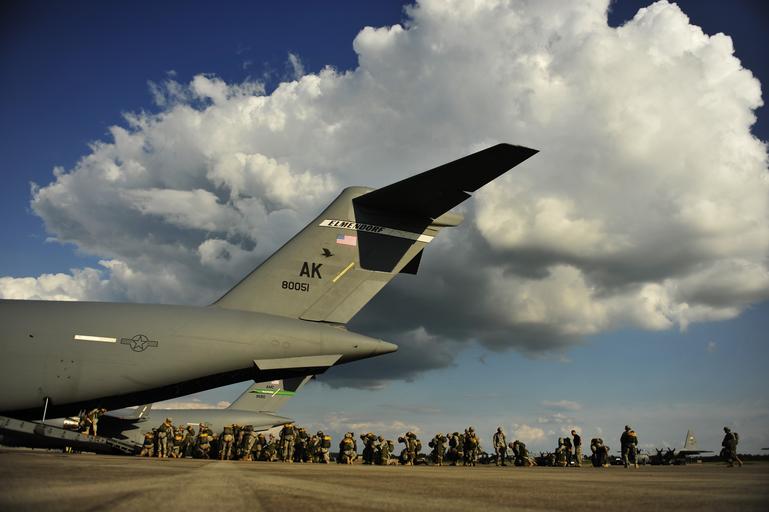 Keywords: 120605-F-RM405-099 (7351864340).jpg U S Soldiers with the 2nd Brigade Combat Team 82nd Airborne Division board a U S Air Force C-17 Globemaster III aircraft before a mission in support of a joint operations access exercise JOAX at Fort Bragg N C June 5 2012 A JOAX is a joint airdrop exercise designed to enhance service cohesiveness between U S Army and Air Force personnel allowing both services an opportunity to properly execute large-scale heavy equipment and troop movement DoD photo by Staff Sgt Eric Harris U S Air Force/Released https //www flickr com/photos/39955793 N07/7351864340/ 120605-F-RM405-099 2012-06-05 18 42 https //www flickr com/people/39955793 N07 U S Department of Defense Current Photos PD-USGov U S Department of Defense Current Photos https //flickr com/photos/39955793 N07/7351864340 2016-09-03 11 14 25 United States Government Work C-130H Hercules Fort Bragg South Carolina Parachutes |