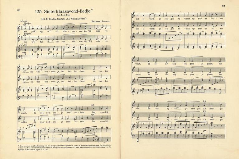 Keywords: 125 Sinterklaasavond-liedje, pagina 180 & 181.jpg Kun je nog zingen zing dan mee Muziek en teksten origineel gepubliceerd voor 1900 own 1915 author PD-old Kun je nog zingen zing dan mee