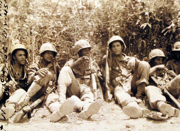 | Keywords: outdoor 127-GW-741-96699: Battle of Peleliu (Operation Stalemate), September-November 1944.  These African-American Marines are from Youngstown, Ohio, Pittsburgh and Philadelphia, Pennsylvania.  They are on Peleliu Island and acting as stretcher bearers.  They have just retruned from the front lines and are catching a couple of minutes rest before returning to the lines.  Photographed by McBride, September 1944.   U.S. Marine Corps Photograph, now in the collections of the National Archives.  (2016/09/06). 127-GW-741-96699: Battle of Peleliu (Operation Stalemate), September-November 1944.  These African-American Marines are from Youngstown, Ohio, Pittsburgh and Philadelphia, Pennsylvania.  They are on Peleliu Island and acting as stretcher bearers.  They have just retruned from the front lines and are catching a couple of minutes rest before returning to the lines.  Photographed by McBride, September 1944.   U.S. Marine Corps Photograph, now in the collections of the National Archives.  (2016/09/06). |