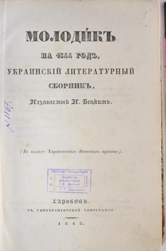| Keywords: Молодик часопис 1280.jpg олодик часопис Ха ьків 1843 Титульний а куш З особистої бібліотеки І Ф анка Molodyk periodical Kharkiv 1843 From Ivan Franko personal Library 1843 Institution Shevchenko Institute of Literature Digital Collection PD-old-70-1923 Books published in Kharkiv Franko Personal Library Collections of books in libraries in Ukraine Shevchenko Institute of Literature Uploaded with VicuñaUploader | ||||
