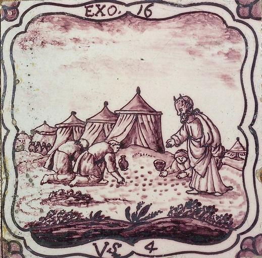 Keywords: 1292-3-mozes-manna.jpg nl Tafereeltegel tegel van tegelveld van vier stuks twee hoog twee breed 'Mozes ziet toe hoe de Israëlieten manna verzamelen' hoekmotief kwartrozet 1760 1850 Museum Rotterdam Museum Rotterdam photograph cc-zero Uploaded with UploadWizard Manna |