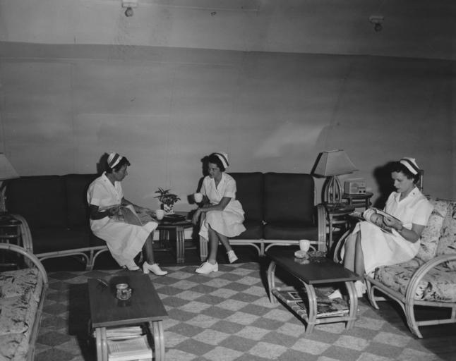 | Keywords: coffee nurses reading blackandwhite monochrome indoor black and white Nurse Corps at USNS Sangley Point Hospital, Philippine Islands, August 23, 1956. [Nurses relaxing in lounge by reading and drinking coffee]. Navy Medicine Historical Files Collection - Facilities - Sangley Point 12-0223-002 Nurse Corps at USNS Sangley Point Hospital, Philippine Islands, August 23, 1956. [Nurses relaxing in lounge by reading and drinking coffee]. Navy Medicine Historical Files Collection - Facilities - Sangley Point 12-0223-002 |