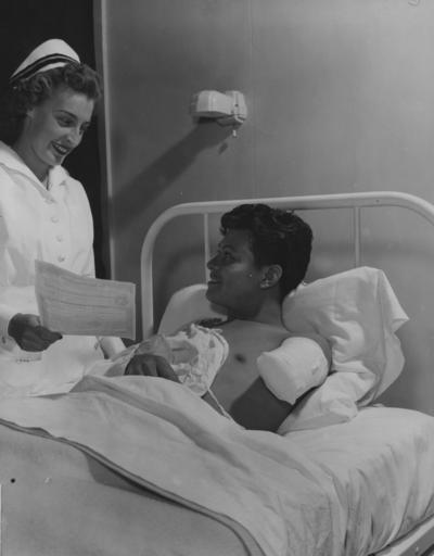 | Keywords: monochrome blackandwhite indoor people black and white Joe Bata, Slc., one-armed sailor, receives war bond from Navy nurse in the Naval Hospital, NAS Seattle, Wash. September 4, 1943. [World War II; amputation]. Navy Medicine Historical Files Collection - Facilities - Seattle 12-0228-002 Joe Bata, Slc., one-armed sailor, receives war bond from Navy nurse in the Naval Hospital, NAS Seattle, Wash. September 4, 1943. [World War II; amputation]. Navy Medicine Historical Files Collection - Facilities - Seattle 12-0228-002 |