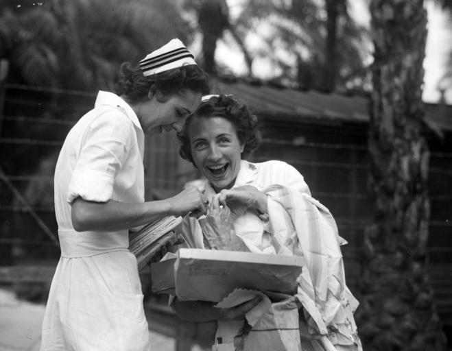 | Keywords: happiness smile blackandwhite people monochrome outdoor black and white Two recently arrived Navy Nurses at a Navy Hospital in the South Pacific receive their first package from home. It's books, candy and lounging pajamas were all very welcome items at this South Pacific base. Guadalcanal? [World War II; South Pacific; mail]. Navy Medicine Historical Files Collection - Facilities - Mobile Hospital #8. 12-0280-017 Two recently arrived Navy Nurses at a Navy Hospital in the South Pacific receive their first package from home. It's books, candy and lounging pajamas were all very welcome items at this South Pacific base. Guadalcanal? [World War II; South Pacific; mail]. Navy Medicine Historical Files Collection - Facilities - Mobile Hospital #8. 12-0280-017 |