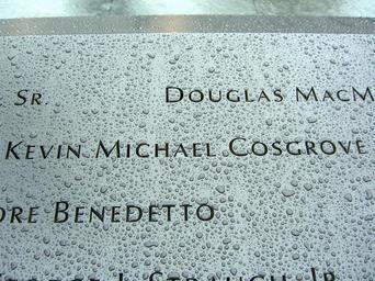 | Keywords: 12.6.11KevinCosgrovePanelS-60ByLuigiNovi7.jpg Kevin Cosgrove is seen among those of other people inscribed on bronze panel S-60 of the South Pool of the National September 11 Memorial in Manhattan as seen on December 6 2011 This photo was created by Luigi Novi You can see a gallery of some of my other photos here If you have any questions you can contact me by sending me an email or User talk Nightscream own Nightscream 2011-12-06 Cc-zero Kevin Cosgrove National September 11 Memorial South Pool name panels |