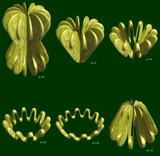 Keywords: mathematica 3d cg parametricplot3d texture torus 輪環 りんかん ドーナツ どーなつ 十二芒星 じゅうにぼうせい 十二光星 じゅうにこうせい 十二稜星 じゅうにりょうせい code program algorithm コード プログラム アルゴリズム geometric sculpture geometricsculpture shape geometry sculpture mapping テクスチャ マッピング 模様 もよう abstract 抽象 ちゅうしょう アブストラクト design pattern デザイン パターン graphic グラフィック グラフィクス structure 意匠 構造 symmetry 対称性 たいしょうせい シンメトリー 対称 たいしょう algorithm コード organic pattern blossom plant black background outdoor a = 12; (* center hole size of a torus *) b = 12; (* 12-angle-torus *) c = 0; (* distance from the center of rotation *) d = 1; (* number of torus *) h = 2; (* height of a torus *) SetOptions[ParametricPlot3D, PlotRange -> Full, Mesh -> None, Boxed -> False, Axes -> False, PlotPoints -> 400, ImageSize -> 1000, Background -> Darker[Green, 0.8], PlotStyle -> Directive[Specularity[White, 30], Texture[Import["D:/tmp/71.jpg"]]], TextureCoordinateFunction -> ({#4, #5 b Pi} &), Lighting -> "Neutral"]; f[v_] := Sin[2 Sin[Sin[Sin[v]]]]; x = (a - Cos[t] - f[b s]) Cos[s + Pi/b]; y = (a - Cos[t] - f[b s]) Sin[s + Pi/b]; z = (a - Sin[t] - h f[b s]) + c; rm = Table[{x, y, z}.RotationMatrix[2 i Pi/d, {1, 0, 0}], {i, d}]; ParametricPlot3D[rm, {t, 0, 2 Pi}, {s, 0, 2 Pi}] (*--- The Texture *) a = 12; (* center hole size of a torus *) b = 12; (* 12-angle-torus *) c = 0; (* distance from the center of rotation *) d = 1; (* number of torus *) h = 2; (* height of a torus *) SetOptions[ParametricPlot3D, PlotRange -> Full, Mesh -> None, Boxed -> False, Axes -> False, PlotPoints -> 400, ImageSize -> 1000, Background -> Darker[Green, 0.8], PlotStyle -> Directive[Specularity[White, 30], Texture[Import["D:/tmp/71.jpg"]]], TextureCoordinateFunction -> ({#4, #5 b Pi} &), Lighting -> "Neutral"]; f[v_] := Sin[2 Sin[Sin[Sin[v]]]]; x = (a - Cos[t] - f[b s]) Cos[s + Pi/b]; y = (a - Cos[t] - f[b s]) Sin[s + Pi/b]; z = (a - Sin[t] - h f[b s]) + c; rm = Table[{x, y, z}.RotationMatrix[2 i Pi/d, {1, 0, 0}], {i, d}]; ParametricPlot3D[rm, {t, 0, 2 Pi}, {s, 0, 2 Pi}] (*--- The Texture *) |