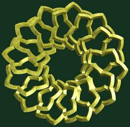 Keywords: mathematica 3d cg parametricplot3d texture torus code program algorithm プログラム コード アルゴリズム 輪環 りんかん ドーナツ どーなつ 六芒星 ろくぼうせい geometric sculpture geometricsculpture shape geometry sculpture mapping テクスチャ マッピング 模様 もよう abstract 抽象 ちゅうしょう アブストラクト design pattern デザイン パターン graphic グラフィック グラフィクス structure 意匠 構造 symmetry 対称性 たいしょうせい シンメトリー 対称 たいしょう black background a = 7; (* center hole size *) b = 6; (* hexa-torus *) c = 12; (* distance from the center of rotation *) d = 12; (* number of torus *) h = 0; (* height of a torus *) SetOptions[ParametricPlot3D, PlotRange -> Full, Mesh -> None, Boxed -> False, Axes -> False, PlotPoints -> 400, ImageSize -> 3000, Background -> RGBColor[{20, 50, 30}/255], PlotStyle -> Directive[Specularity[White, 30], Texture[Import["D:/tmp/71.jpg"]]], TextureCoordinateFunction -> ({#4, #5 Pi} &), Lighting -> "Neutral"]; f[v_] := TriangleWave[{-1, 1}, v/(2 Pi)]; g[v_] := TriangleWave[{-1, 1}, v/(2 Pi) + 1/4]; x = (a - g[t] - f[b s]) Cos[s] + c; y = (a - g[t] - f[b s]) Sin[s] + c; z = (a - f[t] - h f[b s]); rm = Table[{x, y, z}.RotationMatrix[2 i Pi/d, {0, 1, 2}], {i, d}]; ParametricPlot3D[rm, {t, 0, 2 Pi}, {s, 0, Pi}] (*--- The Texture *) a = 7; (* center hole size *) b = 6; (* hexa-torus *) c = 12; (* distance from the center of rotation *) d = 12; (* number of torus *) h = 0; (* height of a torus *) SetOptions[ParametricPlot3D, PlotRange -> Full, Mesh -> None, Boxed -> False, Axes -> False, PlotPoints -> 400, ImageSize -> 3000, Background -> RGBColor[{20, 50, 30}/255], PlotStyle -> Directive[Specularity[White, 30], Texture[Import["D:/tmp/71.jpg"]]], TextureCoordinateFunction -> ({#4, #5 Pi} &), Lighting -> "Neutral"]; f[v_] := TriangleWave[{-1, 1}, v/(2 Pi)]; g[v_] := TriangleWave[{-1, 1}, v/(2 Pi) + 1/4]; x = (a - g[t] - f[b s]) Cos[s] + c; y = (a - g[t] - f[b s]) Sin[s] + c; z = (a - f[t] - h f[b s]); rm = Table[{x, y, z}.RotationMatrix[2 i Pi/d, {0, 1, 2}], {i, d}]; ParametricPlot3D[rm, {t, 0, 2 Pi}, {s, 0, Pi}] (*--- The Texture *) |