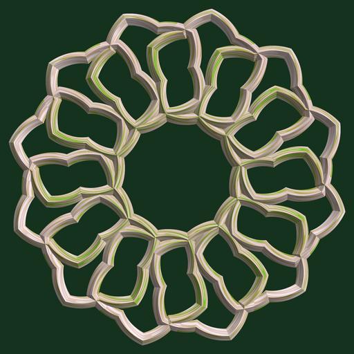 Keywords: mathematica 3d cg parametricplot3d texture torus code program algorithm プログラム コード アルゴリズム 輪環 りんかん ドーナツ どーなつ 五芒星 ごぼうせい geometric sculpture geometricsculpture shape geometry sculpture mapping テクスチャ マッピング 模様 もよう abstract 抽象 ちゅうしょう アブストラクト design pattern デザイン パターン graphic グラフィック グラフィクス structure 意匠 構造 symmetry 対称性 たいしょうせい シンメトリー 対称 たいしょう tangle organic pattern black background a = 8; (* center hole size *) b = 5; (* penta-torus *) c = 12; (* distance from the center of rotation *) d = 12; (* number of torus *) h = 0; (* height of a torus *) SetOptions[ParametricPlot3D, PlotRange -> Full, Mesh -> None, Boxed -> False, Axes -> False, PlotPoints -> 400, ImageSize -> 3000, Background -> RGBColor[{20, 50, 30}/255], PlotStyle -> Directive[Specularity[White, 70], Texture[Import["D:/tmp/862.jpg"]]], TextureCoordinateFunction -> ({#4 + #5, #5 / Pi} &), Lighting -> "Neutral"]; f[v_] := TriangleWave[{-1, 1}, v/(2 Pi)]; g[v_] := TriangleWave[{-1, 1}, v/(2 Pi) + 1/4]; x = (a - g[t] - f[b s]) Cos[s] + c; y = (a - g[t] - f[b s]) Sin[s] + c; z = (a - f[t] - h f[b s]); rm = Table[{x, y, z}.RotationMatrix[2 i Pi/d, {0, 0, 1}], {i, d}]; ParametricPlot3D[rm, {t, 0, 2 Pi}, {s, 0, Pi}] (*--- The Texture *) a = 8; (* center hole size *) b = 5; (* penta-torus *) c = 12; (* distance from the center of rotation *) d = 12; (* number of torus *) h = 0; (* height of a torus *) SetOptions[ParametricPlot3D, PlotRange -> Full, Mesh -> None, Boxed -> False, Axes -> False, PlotPoints -> 400, ImageSize -> 3000, Background -> RGBColor[{20, 50, 30}/255], PlotStyle -> Directive[Specularity[White, 70], Texture[Import["D:/tmp/862.jpg"]]], TextureCoordinateFunction -> ({#4 + #5, #5 / Pi} &), Lighting -> "Neutral"]; f[v_] := TriangleWave[{-1, 1}, v/(2 Pi)]; g[v_] := TriangleWave[{-1, 1}, v/(2 Pi) + 1/4]; x = (a - g[t] - f[b s]) Cos[s] + c; y = (a - g[t] - f[b s]) Sin[s] + c; z = (a - f[t] - h f[b s]); rm = Table[{x, y, z}.RotationMatrix[2 i Pi/d, {0, 0, 1}], {i, d}]; ParametricPlot3D[rm, {t, 0, 2 Pi}, {s, 0, Pi}] (*--- The Texture *)