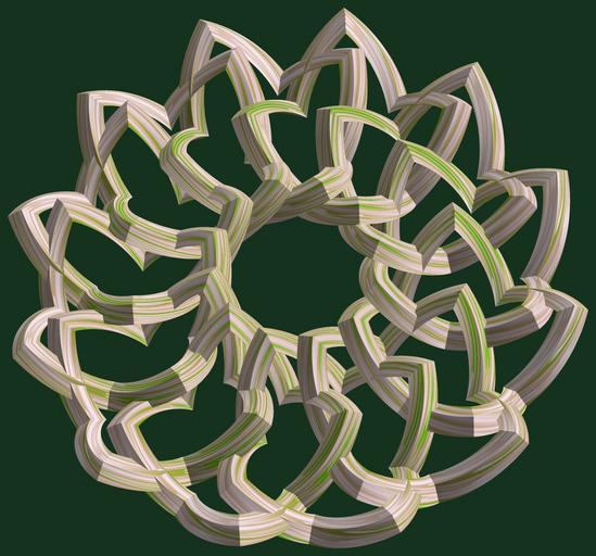 Keywords: mathematica 3d cg parametricplot3d texture torus code program algorithm プログラム コード アルゴリズム 輪環 りんかん ドーナツ どーなつ 四芒星 しぼうせい geometric sculpture geometricsculpture shape geometry sculpture mapping テクスチャ マッピング 模様 もよう abstract 抽象 ちゅうしょう アブストラクト design pattern デザイン パターン graphic グラフィック グラフィクス structure 意匠 構造 symmetry 対称性 たいしょうせい シンメトリー 対称 たいしょう tangle black background organic pattern indoor a = 6; (* center hole size *) b = 4; (* tetra-torus *) c = 8; (* distance from the center of rotation *) d = 12; (* number of torus *) h = 3; (* height of a torus *) SetOptions[ParametricPlot3D, PlotRange -> Full, Mesh -> None, Boxed -> False, Axes -> False, PlotPoints -> 400, ImageSize -> 3000, Background -> RGBColor[{20, 50, 30}/255], PlotStyle -> Directive[Specularity[White, 70], Texture[Import["D:/tmp/862.jpg"]]], TextureCoordinateFunction -> ({#4 + #5, #5 / Pi} &), Lighting -> "Neutral"]; f[v_] := TriangleWave[{-1, 1}, v/(2 Pi)]; g[v_] := TriangleWave[{-1, 1}, v/(2 Pi) + 1/4]; x = (a - g[t] - f[b s]) Cos[s] + c; y = (a - g[t] - f[b s]) Sin[s] + c; z = (a - f[t] - h f[b s]); rm = Table[{x, y, z}.RotationMatrix[2 i Pi/d, {0, 0, 1}], {i, d}]; ParametricPlot3D[rm, {t, 0, 2 Pi}, {s, 0, Pi}] (*--- The Texture *) a = 6; (* center hole size *) b = 4; (* tetra-torus *) c = 8; (* distance from the center of rotation *) d = 12; (* number of torus *) h = 3; (* height of a torus *) SetOptions[ParametricPlot3D, PlotRange -> Full, Mesh -> None, Boxed -> False, Axes -> False, PlotPoints -> 400, ImageSize -> 3000, Background -> RGBColor[{20, 50, 30}/255], PlotStyle -> Directive[Specularity[White, 70], Texture[Import["D:/tmp/862.jpg"]]], TextureCoordinateFunction -> ({#4 + #5, #5 / Pi} &), Lighting -> "Neutral"]; f[v_] := TriangleWave[{-1, 1}, v/(2 Pi)]; g[v_] := TriangleWave[{-1, 1}, v/(2 Pi) + 1/4]; x = (a - g[t] - f[b s]) Cos[s] + c; y = (a - g[t] - f[b s]) Sin[s] + c; z = (a - f[t] - h f[b s]); rm = Table[{x, y, z}.RotationMatrix[2 i Pi/d, {0, 0, 1}], {i, d}]; ParametricPlot3D[rm, {t, 0, 2 Pi}, {s, 0, Pi}] (*--- The Texture *) |