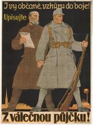 Keywords: 12 Sammlung Eybl (Slg.Nr. 1284) I vy občané - 1917, A. Erhardt.jpg Österreich-Ungarn A Erhardt I vy občané Auch ihr Bürger auf in den Kampf Zeichnet 7 Kriegsanleihe 1917 123 x 90 cm Slg Nr 1284 Die Aufforderung Kriegsanleihe zu zeichnen wandte sich an die Bürger im Hinterland deren Söhne oft als Soldaten an der Front standen In solchen Fällen sollten die Eltern schon zu deren Unterstützung Geld zur Verfügung stellen Hier steht der Vater in gleich entschlossener Pose hinter dem uniformierten Sohn Wenn der Alte auch körperlich nicht mehr in der Lage ist mit dem Sohn in den Krieg zu ziehen so kann er ihn doch durch Zeichnung von Kriegsanleihe die er schon in der Hand hält unterstützen Die Blicke von Vater und Sohn sind nahezu ident bereit jeder auf seine Art für den Sieg zu kämpfen Die verschiedenen Ortschaften im Hintergrund symbolisieren die Spannweite der österreichischen Bevölkerung von mitteleuropäischen Dörfern bis zu mediterranen Siedlungen Alle sind Teil einer großen Familie dem Kaiserreich Österreich-Ungarn Österreich-Ungarn A Erhardt I vy občané You too citizens on to the fight Draw 7th War Loan 123 x 90 cm 1917 Slg Nr 1284 The invitation to subscribe for war bonds turned to the citizens in the back lands whose sons were often at the front as soldiers In such cases parents should make money available for support Here the father is in the same resolute pose behind the uniformed son When the old man is no longer physically able to move with the son in the war so he can support by subscribing war bonds that he holds in his hand The eyes of father and son are almost identical ready to fight everyone on his way to the victory The various localities in the background symbolize the span of the Austrian population - of Central European villages to Mediterranean settlements All are part of a large family - the Empire of Austria-Hungary Sammlung Eybl Plakatmuseum Wien 2009-07-30 16 20 01 A Erhardt Credit line Eybl Plakatmuseum Wien/Wikimedia Commons CC-BY-SA-4 0 wiki Sammlung Eybl Plakatmuseum Wien PD-old-100-1923 World War I posters of Austria-Hungary War bonds Plakatmuseum Wien Eybl Collection Quality images by Hubertl QualityImage |