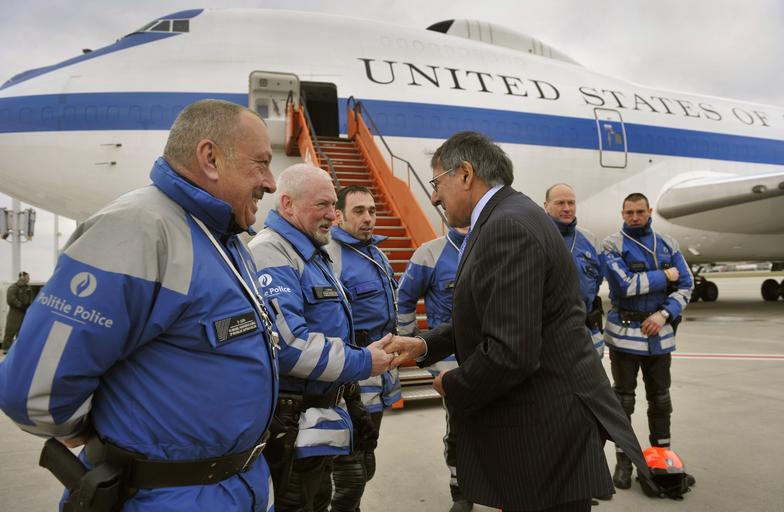 Keywords: 130222-D-NI589-415 (8507883108).jpg Secretary of Defense Leon E Panetta center thanks members of the motorcycle police force who escorted his motorcade during his visit to meet with defense leaders of NATO member nations at NATO headquarters in Brussels Feb 22 2013 DoD photo by Glenn Fawcett/Released https //www flickr com/photos/39955793 N07/8507883108/ 130222-D-NI589-415 2013-02-22 08 33 https //www flickr com/people/39955793 N07 U S Department of Defense Current Photos PD-USGov U S Department of Defense Current Photos https //flickr com/photos/39955793 N07/8507883108 2016-09-03 09 13 38 United States Government Work United States Department of Defense Leon Panetta in 2013 Police of Belgium