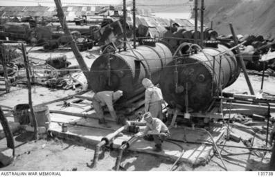 | Keywords: 131738 THESE TANKS, EACH HOLDING 5 TONS, ARE BEACH-HEAD RESERVOIRS IN WHICH MUSTARD GAS IS STORED PRIOR TO ITS TRANSFERENCE BY PIPELINE TO TANKS ON A LANDING SHIP, TANK (LST).jpg en OKUNOSHIMA JAPAN THESE TANKS EACH HOLDING 5 TONS ARE BEACH-HEAD RESERVOIRS IN WHICH MUSTARD GAS IS STORED PRIOR TO ITS TRANSFERENCE BY PIPELINE TO TANKS ON A LANDING SHIP TANK LST FEEDER PIPE AND VALVES FOR ADJUSTING FLOW ARE IN FOREGROUND MAJOR W E WILLIAMSON CHEMICAL WARFARE SECTION UNITED STATES ARMY FOREGROUND IS WITH JAPANESE WORKMEN IN PROTECTIVE CLOTHING 1946-08-03 131738 Queale Alan other versions Custom license marker 2016 07 12 Copyright expired - public domain PD-AustraliaGov Chemical weapons in Okunoshima 1946-1947 |