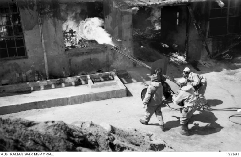 | Keywords: 132591 JAPANESE WORKMEN WEARING GAS-MASKS DIRECTED JETS FROM A MOBILE FLAME-THROWER AND WITHIN A MATTER OF SECONDS THE INTERIOR OF THE BUILDING WAS A RAGING INFERNO.JPG en OKUNOSHIMA JAPAN JAPANESE WORKMEN WEARING GAS-MASKS DIRECTED JETS FROM A MOBILE FLAME-THROWER AND WITHIN A MATTER OF SECONDS THE INTERIOR OF THE BUILDING WAS A RAGING INFERNO THE MUSTARD GAS PLANT FRENCH PATT OF THE TOKYO 2ND ARMY ARSENAL SITUATED ON OKUNOSHIMA ISLAND OF THE INLAND SEA WAS BEING DECONTAMINATED BY FIRE THE DESTRUCTION OF THE POISON GAS ON THE ISLAND WAS COMPLETED SEVERAL MONTHS AGO PRIOR TO BURNING THE INTERIOR OF THE LARGE CONCRETE AND BRICK BUILDING WAS STACKED WITH PILES OF GASOLINE-SOAKED DEBRIS THE WORK OF DECONTAMINATION WAS CARRIED OUT BY THE TEIKOKU RAYON COMPANY UNDER CONTRACT FROM THE JAPANESE GOVERNMENT AND UNDER SUPERVISION OF THE DISPOSAL ENEMY EQUIPMENT SECTION BCOF DEE SEC 132591 Queale Alan 1947-03-20 Copyright expired - public domain PD-AustraliaGov Chemical weapons in Okunoshima 1946-1947 British Commonwealth Occupation Force |
