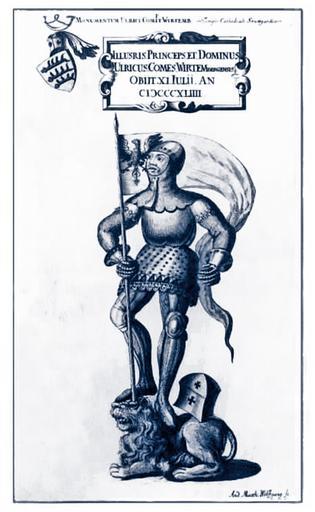 | Keywords: 1336 Ulrich III Reichssturmfahne LMZ2 114909.jpg de Graf Ulrich III von Württemberg 1292 “1344 mit Reichssturmfahne “ nach der Belehnung 1336 mit Grüningen und der Reichssturmfahne schwarzer Adler auf goldenem Grund an roter Stange “ Kupferstich LMZ/Bothner Matth Wolffgang after 1344 Count Ulrich III of Württemberg History of Markgröningen Reichssturmfahne PD-old | ||||