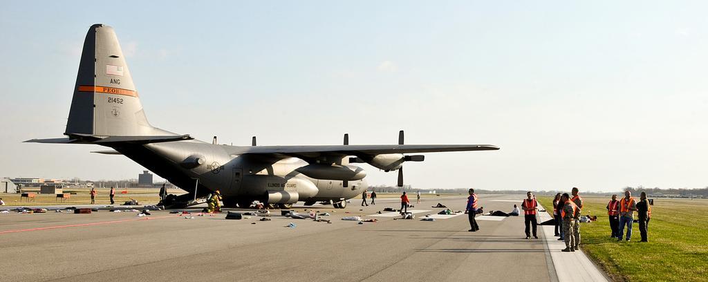 | Keywords: air force airforce usaf 182 aw 182aw 182nd airlift wing 182ndairliftwing peoria illinois ang air national guard airnationalguard illinois air national guard illinoisairnationalguard ilang peoria air national guard base peoriaairnationalguardbase peoria angb peoriaangb ngb amc air mobility command airmobilitycommand kpia pia peoria international airport peoriainternationalairport mass casualty masscasualty accident exercise crash injury injuries victim fire department firedepartment firefighter emergency response simulate casualties test civil engineer squadron civilengineersquadron ces training eet rescue triage il usa vehicle outdoor aircraft airplane Exercise evaluation team members (wearing orange) watch as first responders rescue simulated victims during a mass-casualty exercise in Peoria, Ill., April 12, 2014. An Illinois Air National Guard C-130 Hercules was used to imitate an aircraft crash with 50 casualties on a Gen. Wayne A. Downing Peoria International Airport runway. The airport hosted the tri-annual exercise to test its emergency protocols. Several emergency-response agencies, including the 182nd Civil Engineer Squadron fire department, also participated in the exercise to practice their procedures and training. (U.S. Air National Guard photo by Staff Sgt. Lealan Buehrer/Released) Exercise evaluation team members (wearing orange) watch as first responders rescue simulated victims during a mass-casualty exercise in Peoria, Ill., April 12, 2014. An Illinois Air National Guard C-130 Hercules was used to imitate an aircraft crash with 50 casualties on a Gen. Wayne A. Downing Peoria International Airport runway. The airport hosted the tri-annual exercise to test its emergency protocols. Several emergency-response agencies, including the 182nd Civil Engineer Squadron fire department, also participated in the exercise to practice their procedures and training. (U.S. Air National Guard photo by Staff Sgt. Lealan Buehrer/Released)  |