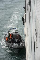 Keywords: 140419-N-AP176-020 (14003674573).jpg U S Sailors assigned to Naval Special Warfare Group 10 and Cameroonian service members conduct a simulated boarding of the joint high speed vessel USNS Spearhead JHSV 1 during Obangame Express 2014 in the Gulf of Guinea April 19 2014 Obangame Express is a maritime exercise conducted by U S Naval Forces Africa to improve cooperation among African partner nations in order to increase safety and security in the Gulf of Guinea DoD photo by Mass Communication Specialist 2nd Class Jeff Atherton U S Navy /Released https //www flickr com/photos/39955793 N07/14003674573/ 140419-N-AP176-020 2014-04-23 11 07 https //www flickr com/people/39955793 N07 U S Department of Defense Current Photos PD-USGov U S Department of Defense Current Photos https //flickr com/photos/39955793 N07/14003674573 2016-09-03 07 13 54 United States Government Work Gulf of Guinea Sailors United States Department of Defense |