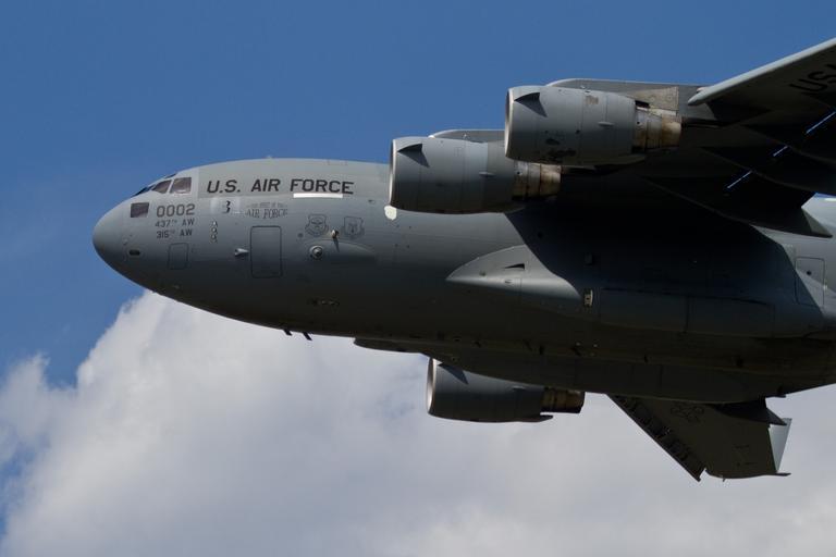 MAKE A MEME View Large Image Air Force C-17 Globemaster III "Spirit of the Air Force" from the 437th Airlift Wing carrying Airmen and cargo from the 177th Fighter Wing takes off from Atlantic City International Airport, N.J. on May 20, 2014. Airmen ...