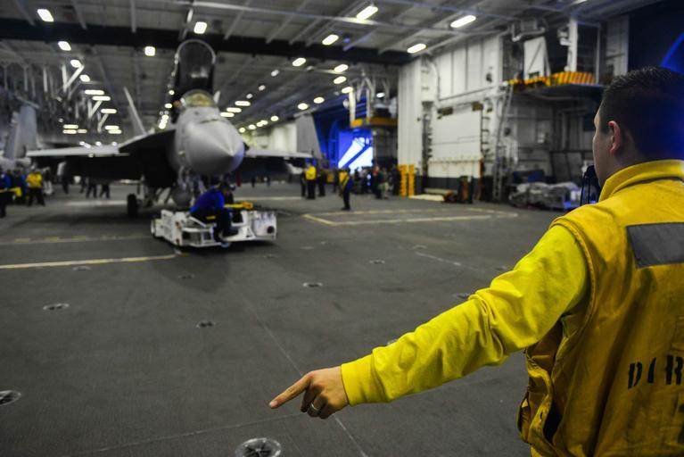 Keywords: aircraft carrier aircraftcarrier cvn 74 cvn74 john c. stennis johncstennis mcsn christopher frost mcsnchristopherfrost outdoor 141210-N-IK337-072 PACIFIC OCEAN (Dec. 10, 2014) - Aviation Boatswain's Mate (Handling) 2nd Class Ray Amaya, from San Benito, Texas, directs a tractor driver while parking an F/A-18E Super Hornet from the Fist of the Fleet of Strike Fighter Squadron (VFA) 25 in the hangar bay of Nimitz-class aircraft carrier USS John C. Stennis (CVN 74). Stennis is currently undergoing an operational training period in preparation for future deployments. (U.S. Navy Photo by Mass Communication Specialist Seaman Christopher Frost / Released) 141210-N-IK337-072 PACIFIC OCEAN (Dec. 10, 2014) - Aviation Boatswain's Mate (Handling) 2nd Class Ray Amaya, from San Benito, Texas, directs a tractor driver while parking an F/A-18E Super Hornet from the Fist of the Fleet of Strike Fighter Squadron (VFA) 25 in the hangar bay of Nimitz-class aircraft carrier USS John C. Stennis (CVN 74). Stennis is currently undergoing an operational training period in preparation for future deployments. (U.S. Navy Photo by Mass Communication Specialist Seaman Christopher Frost / Released) |