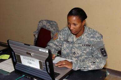 Keywords: 149th IBCT – COB Speicher's 'Strength & Honor' DVIDS31865.jpg en Sgt 1st Class Terryl Green 506th Quartermaster Company uses the computer lab in the education center at Contingency Operating Base Speicher Iraq which is maintained by the 149th IBCT 2006-10-19 Sgt Tyrone Marshall https //www dvidshub net/image/31865 31865 2006-10-19 09 25 TIKRIT IQ 3 PD-USGov Contingency Operating Base Speicher Images from DoD uploaded by Fæ |