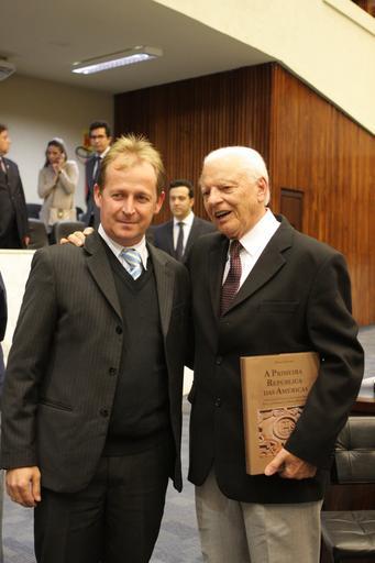 Keywords: Ex-prefeito de Guarapuava e ex-deputado Nivaldo Krüger, e o deputado Elton Welter (PT) no lançamento do livro “A Primeira República das Américas” na Assembleia Legislativa. Foto: Nani Gois/Alep (crédito obrigatório)