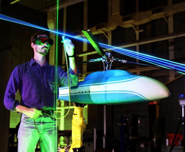 | Keywords: (1992-L-03539): Laser velocimetry, seen here being set up with a helicopter model in the 14- by 22-Foot Tunnel, enables accurate measurement of complex flow fields, such as those around spinning helicopter rotors. (1992-L-03539): Laser velocimetry, seen here being set up with a helicopter model in the 14- by 22-Foot Tunnel, enables accurate measurement of complex flow fields, such as those around spinning helicopter rotors. | ||||
